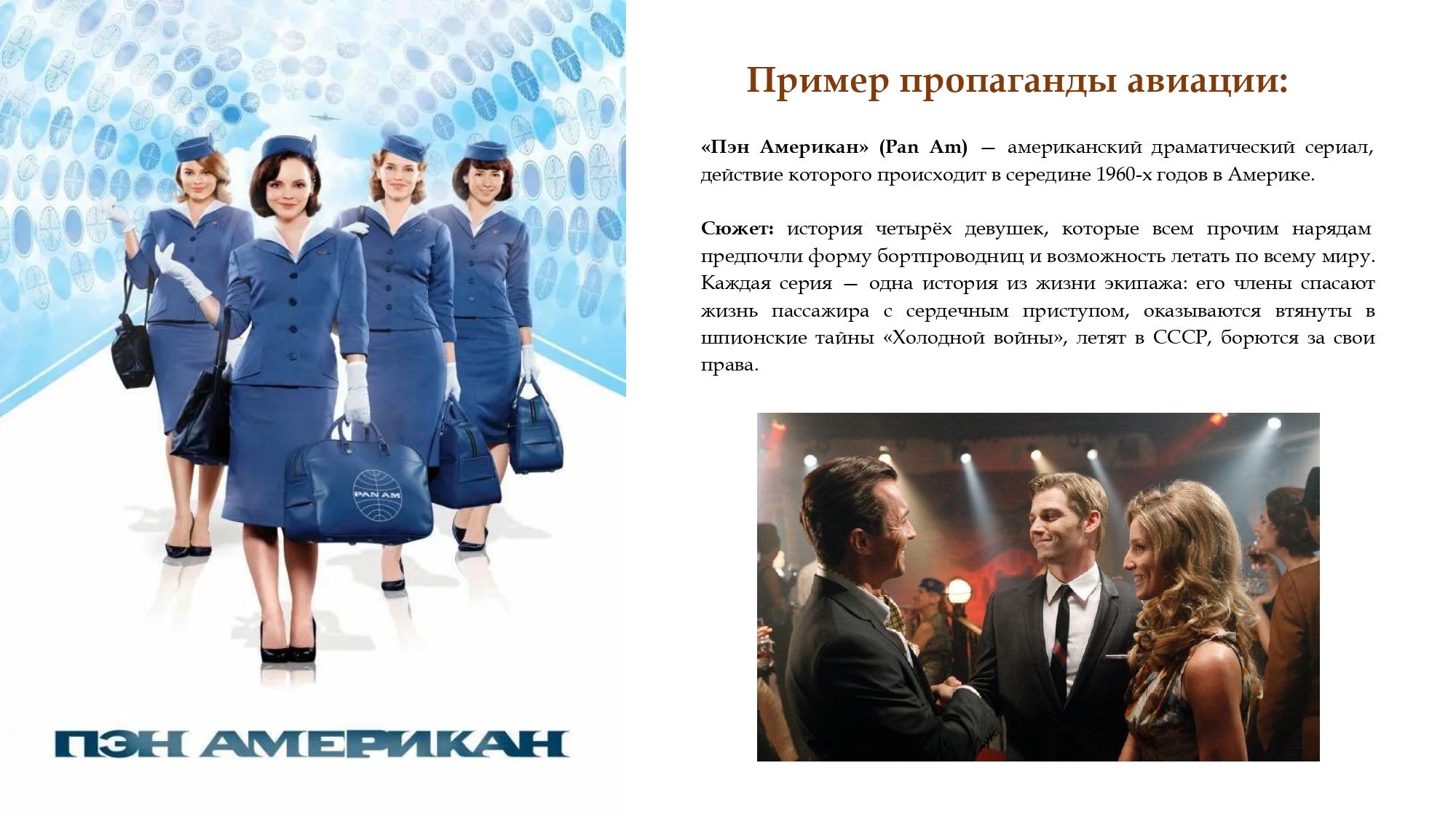 — У американцев были проблемы с набором в авиацию. Решено тогда все было созданием сериала «Пан Американ», который вдохнул во многих людей мечту о небе. Я считаю, что наш Минкульт должен снять нечто подобное.