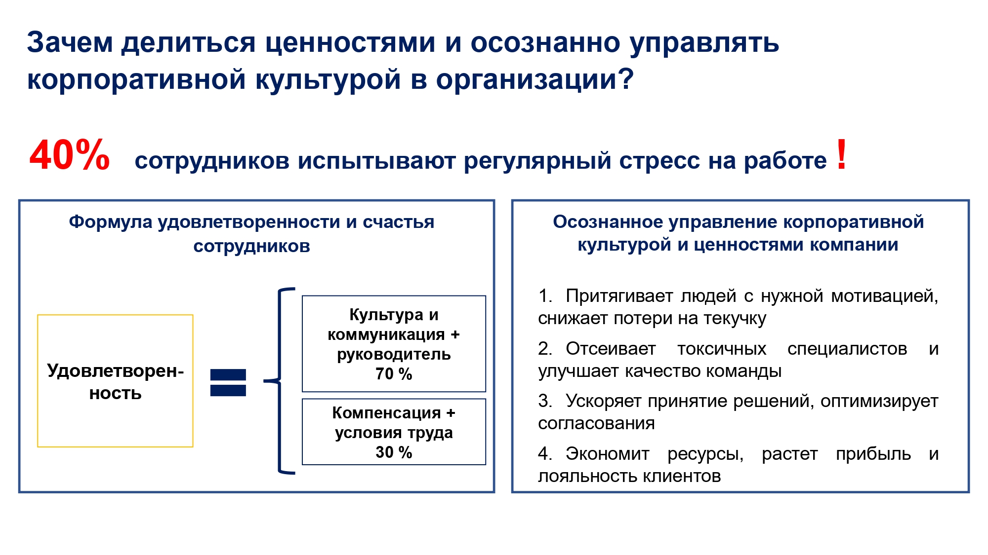 — Согласно последним исследованиям, порядка 40% сотрудников испытывают стресс на работе, то есть работа для них — это форма страдания. Эти показатели очень удручают, ведь работодатель должен задумываться о том, как чувствуют себя сотрудники его компании, и как сделать так, чтобы работа приносила трудящемуся удовольствие и счастье.