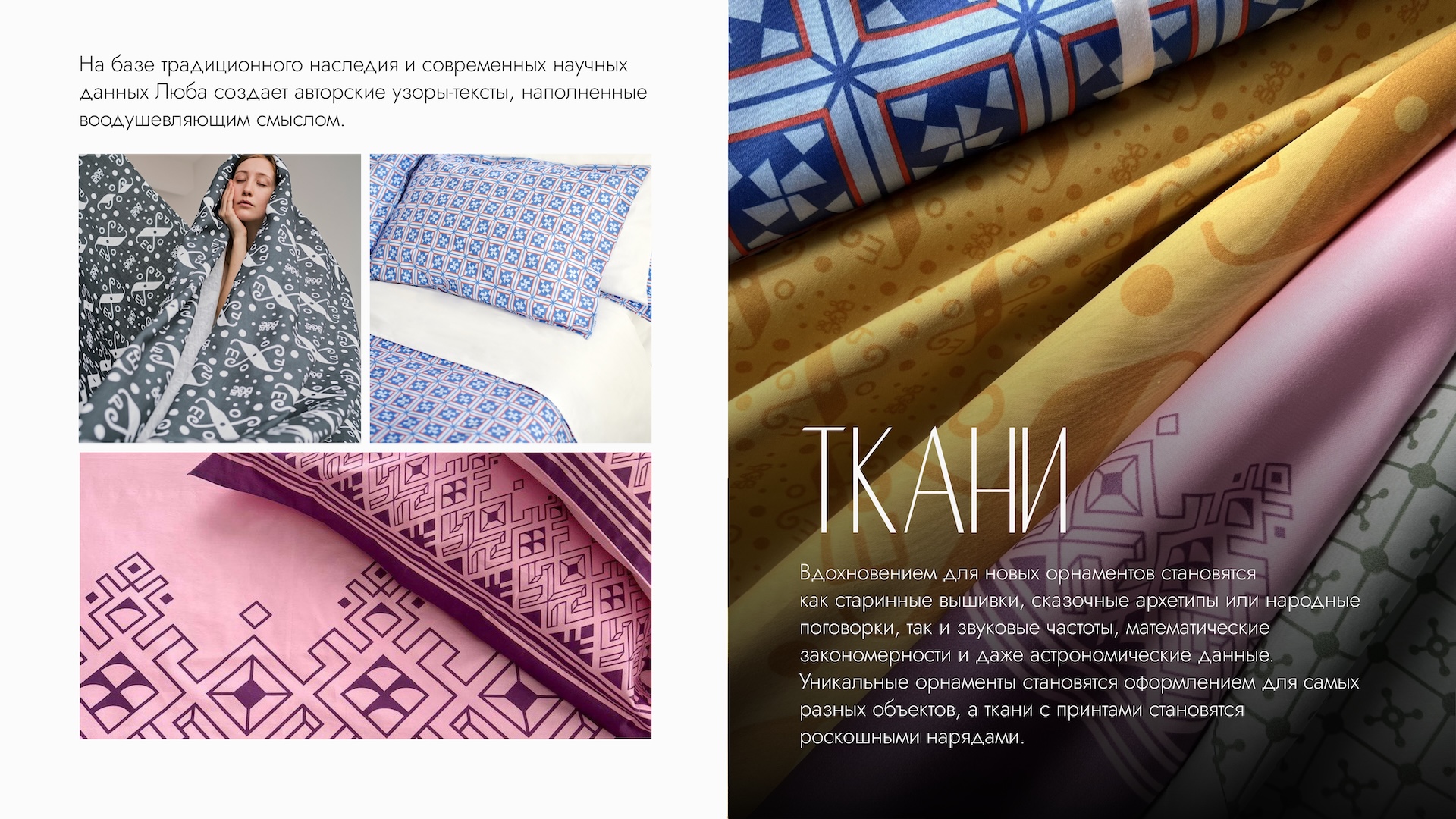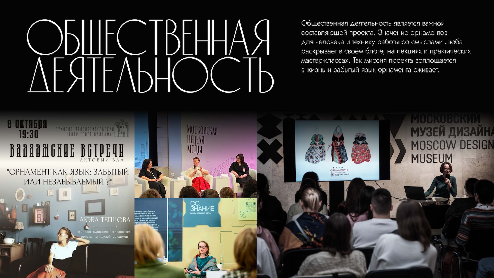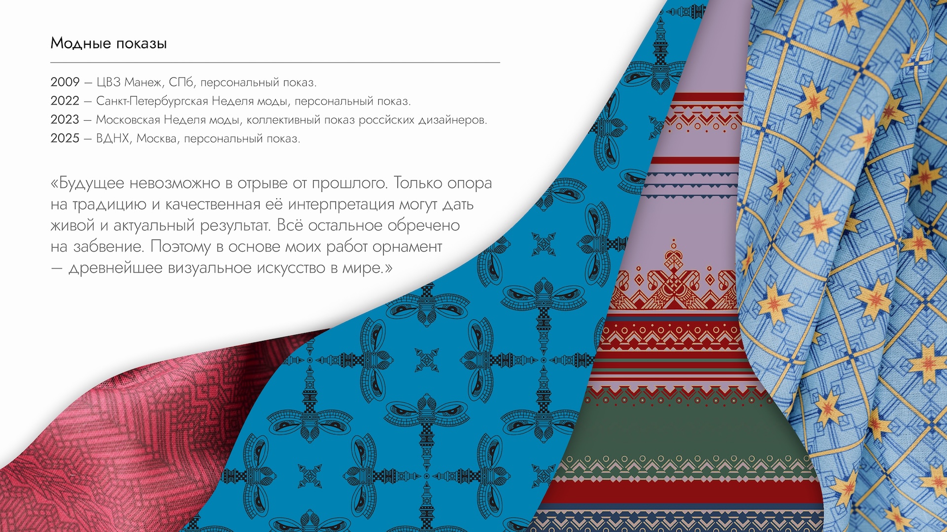 — Орнамент — универсальный феномен и метаязык, который все империи и цивилизации использовали для трансляции ключевых идей и формирования сознания. Всего сто лет назад люди перестали воспринимать его как язык, свели к простому декору. Моя миссия — возродить в обществе понимание орнамента как мощного средства коммуникации.