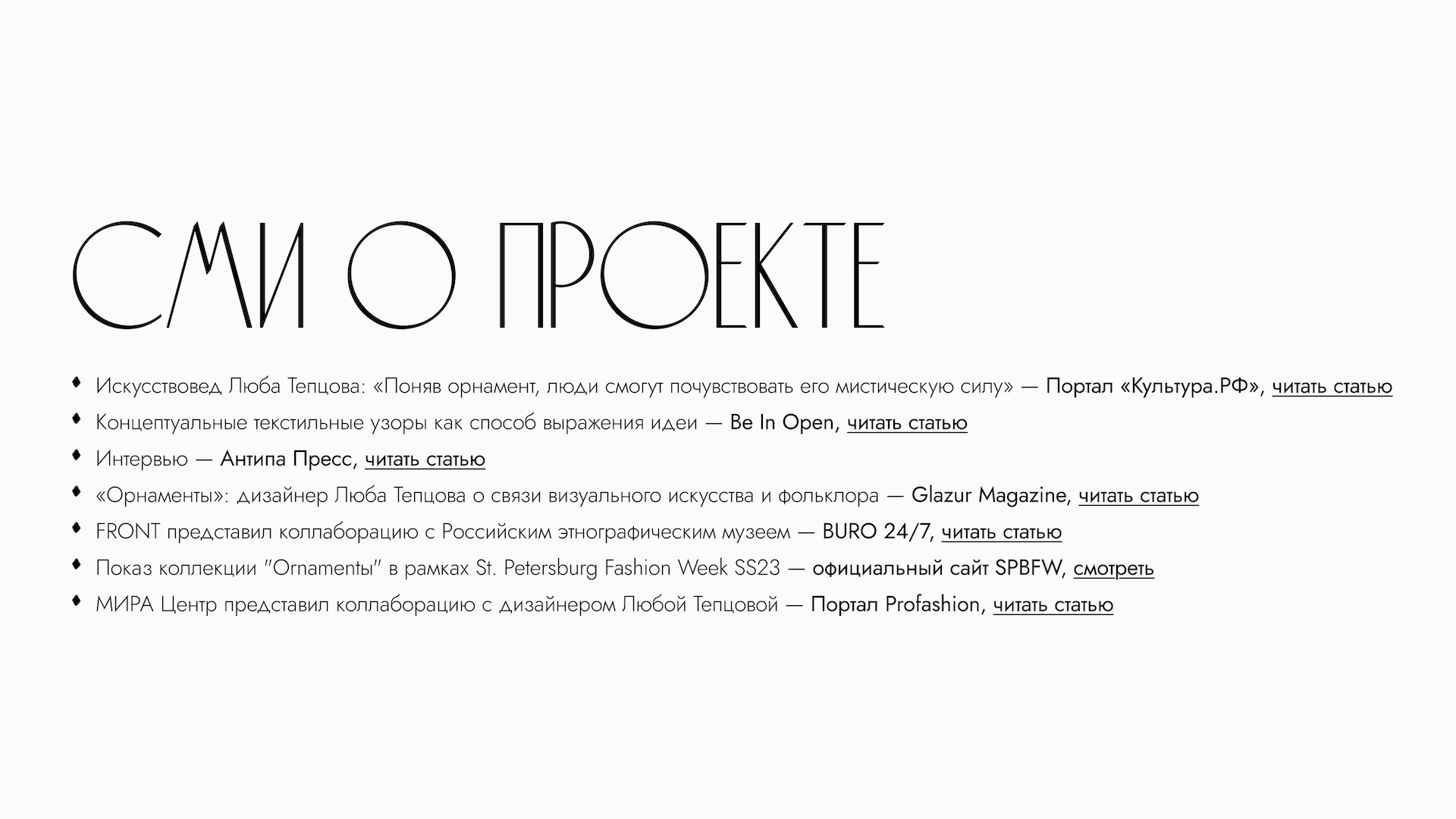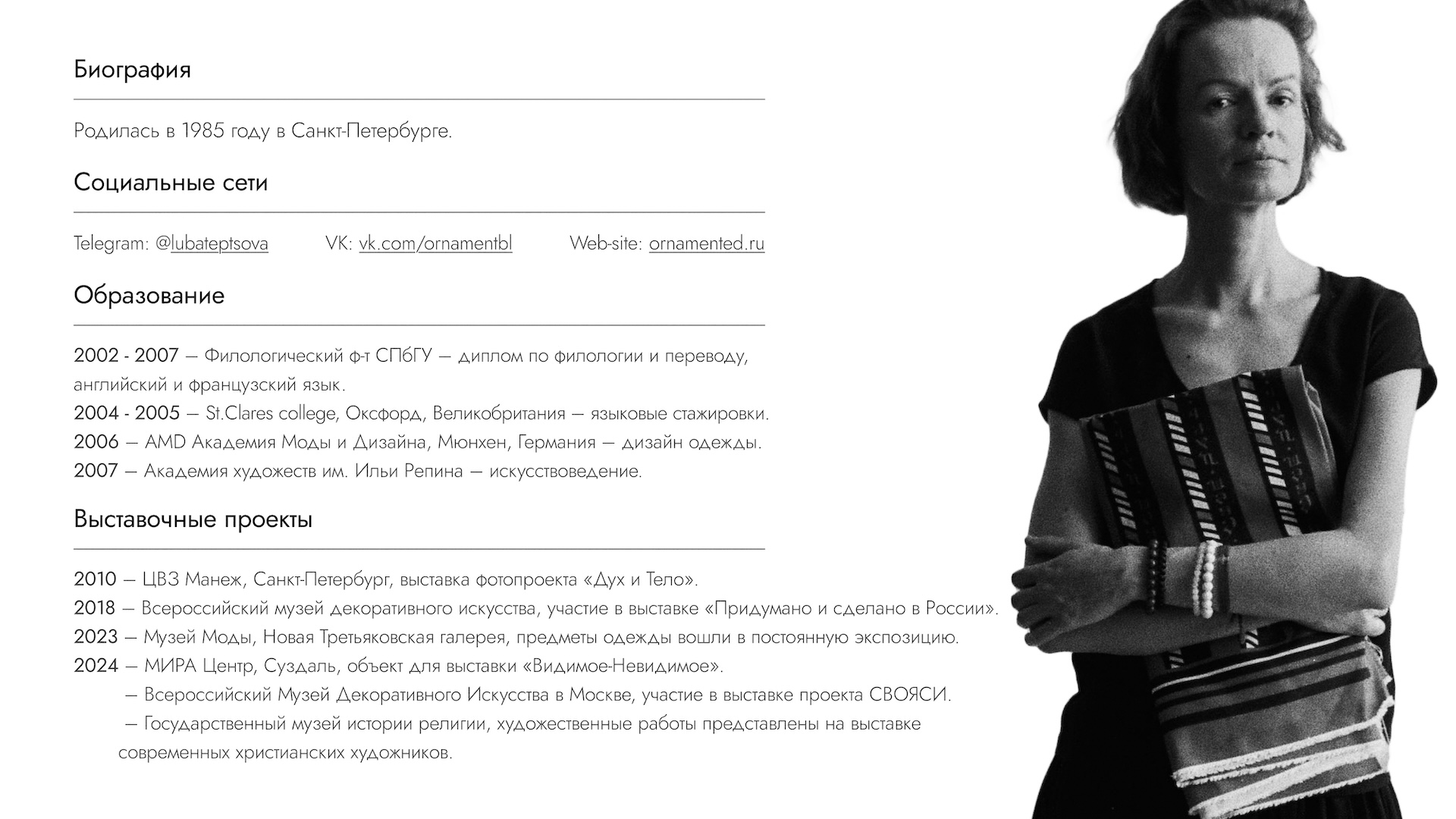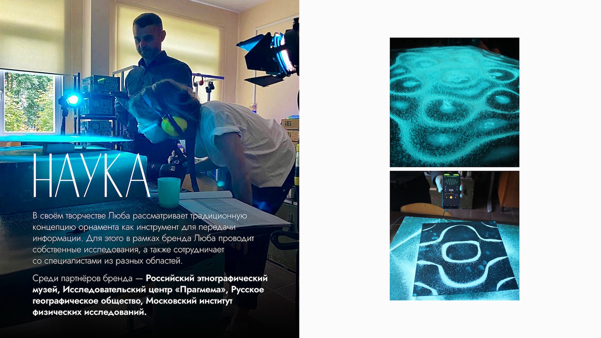 — Орнамент — универсальный феномен и метаязык, который все империи и цивилизации использовали для трансляции ключевых идей и формирования сознания. Всего сто лет назад люди перестали воспринимать его как язык, свели к простому декору. Моя миссия — возродить в обществе понимание орнамента как мощного средства коммуникации.