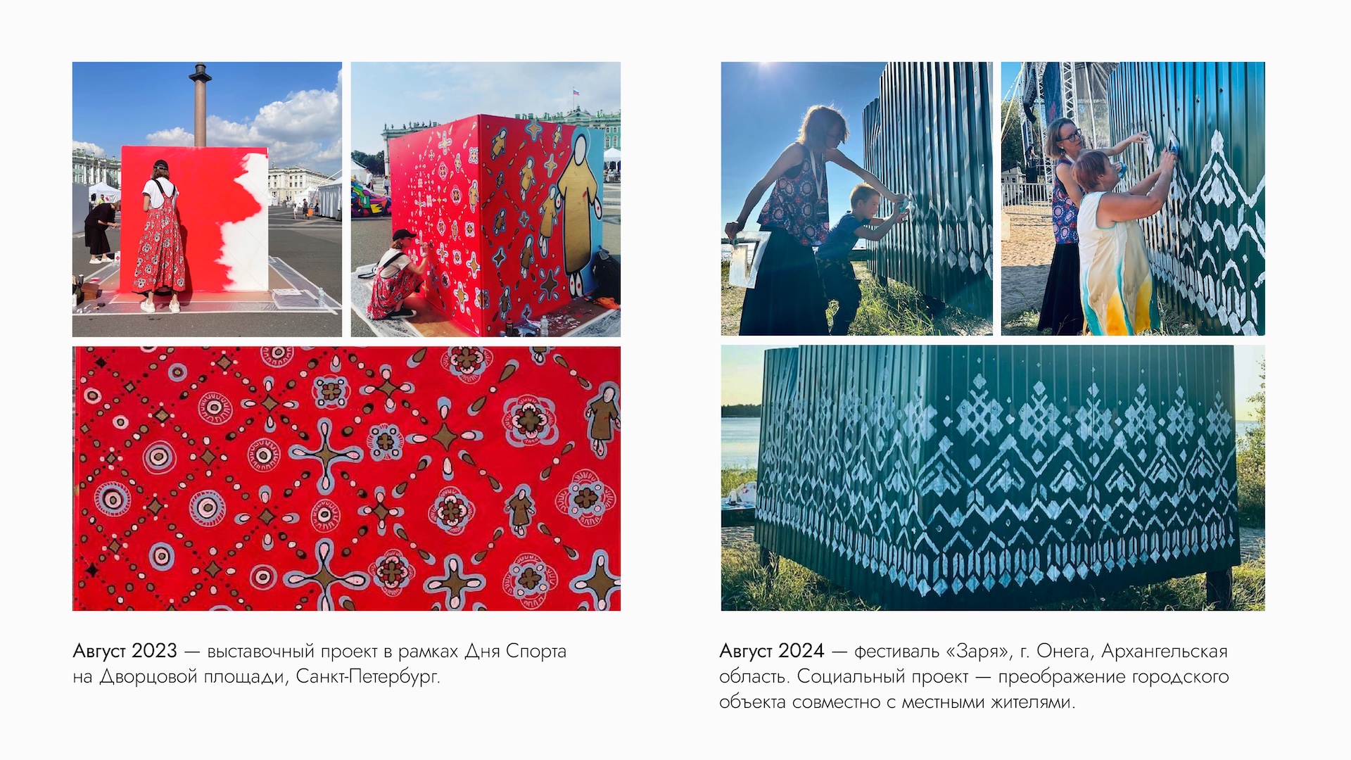 — Как филолог я считаю: чтобы оживить язык, на нём нужно говорить. Поэтому я не только создаю авторские работы, но и вовлекаю людей в совместное творчество. Орнамент становится инструментом «соборности» — он легко доступен каждому и позволяет сообща преобразовывать пространство, наполняя его жизнеутверждающими смыслами, что мы и доказали на фестивале в Онеге.