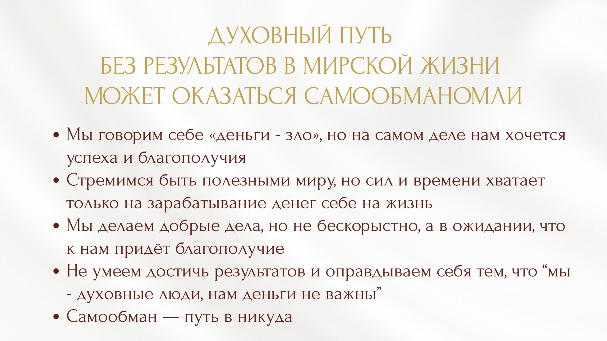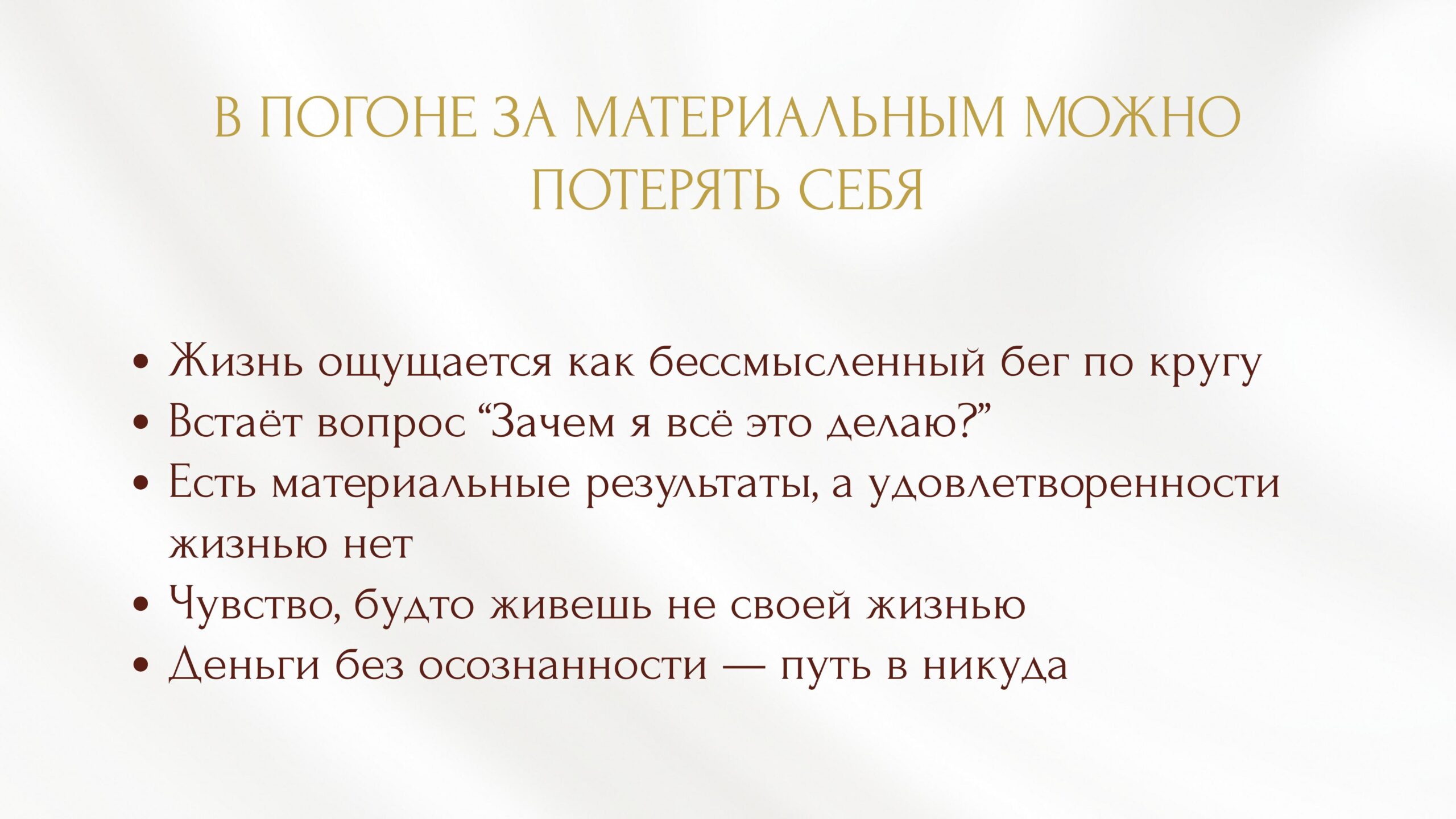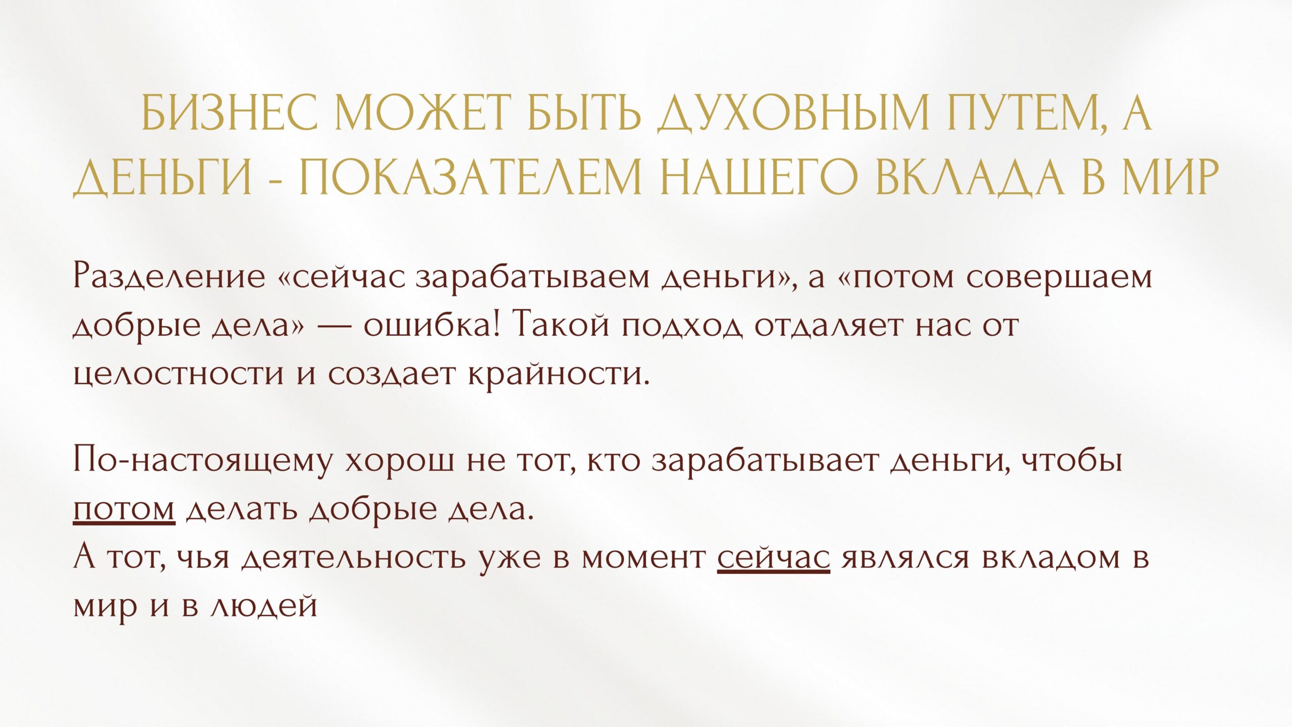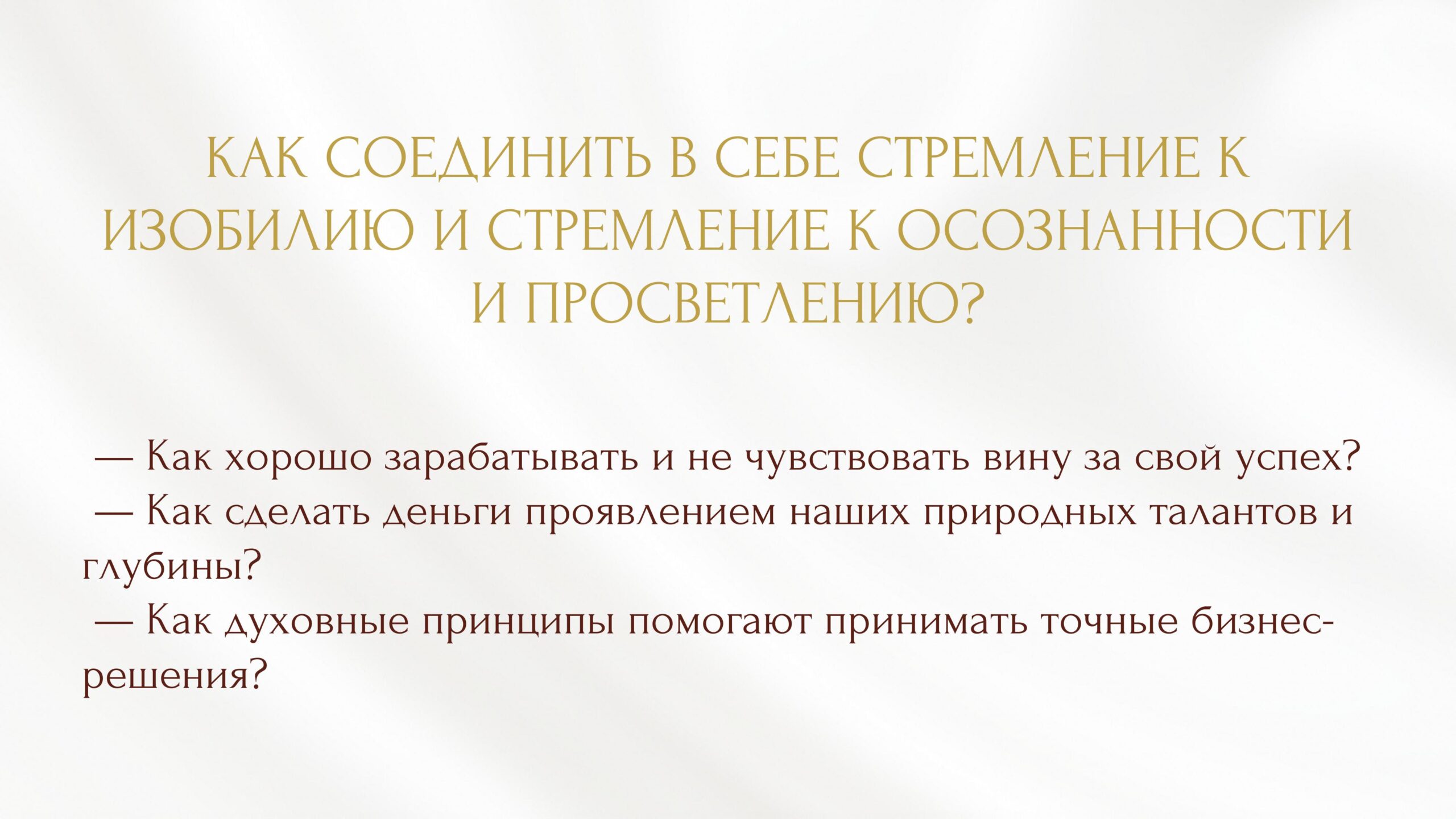 — Предприниматели часто упираются в кризис смыслов. Они бегут за деньгами и в какой-то момент перестают понимать, зачем они это делают. Бег за деньгами без осознанности, без духовного развития — это путь в никуда.