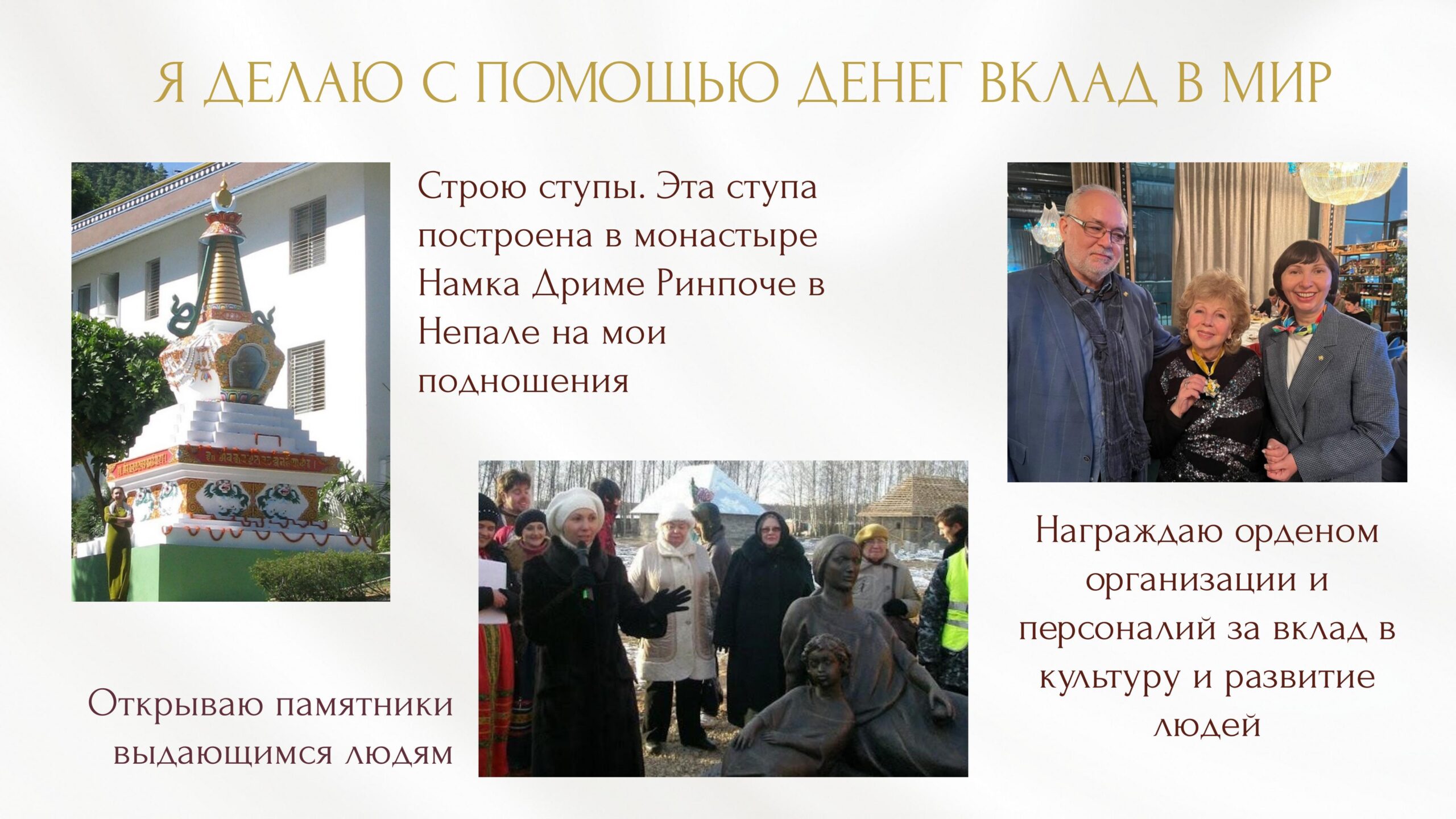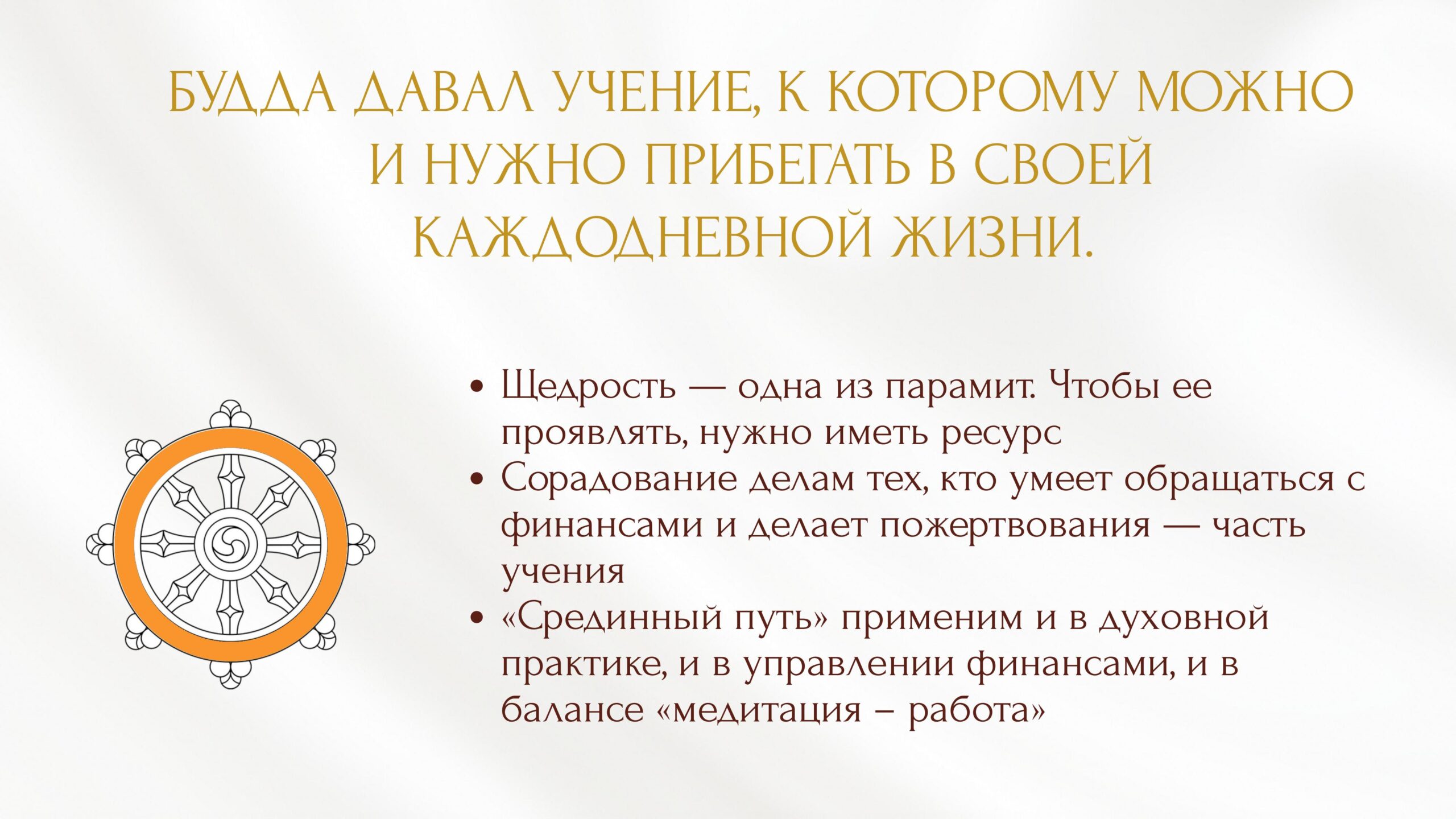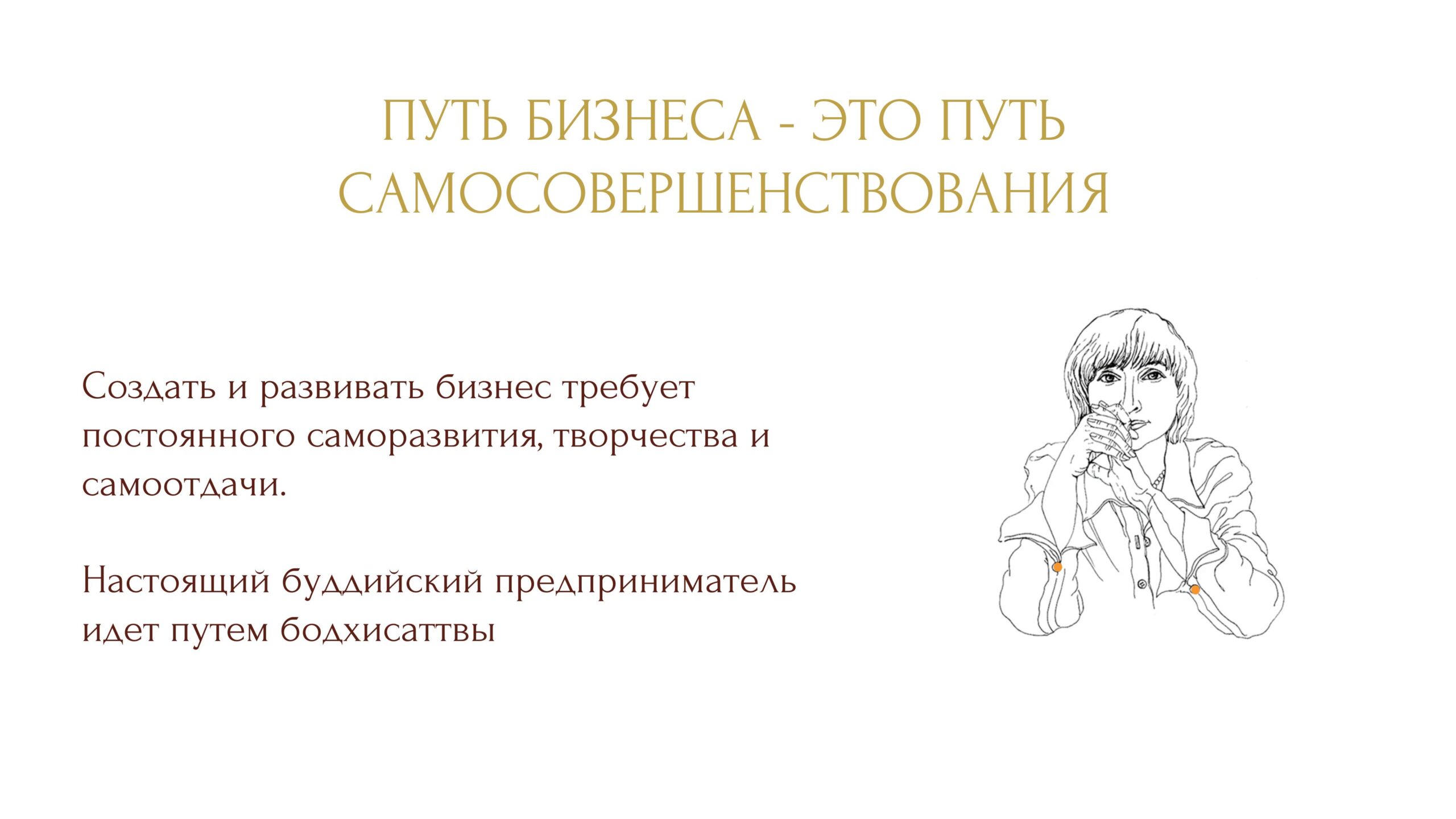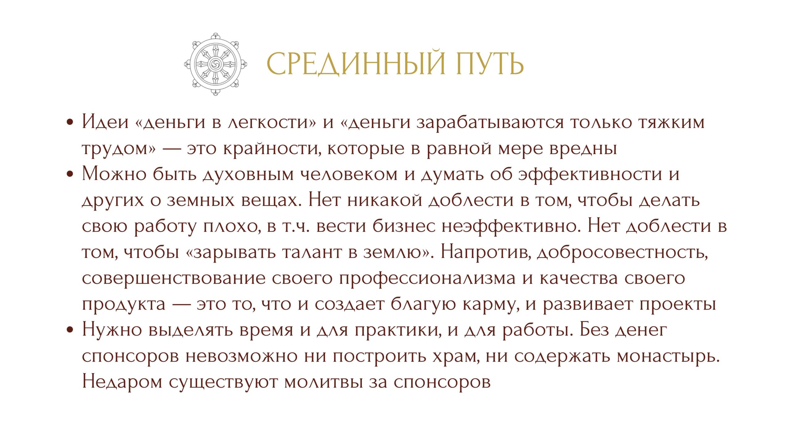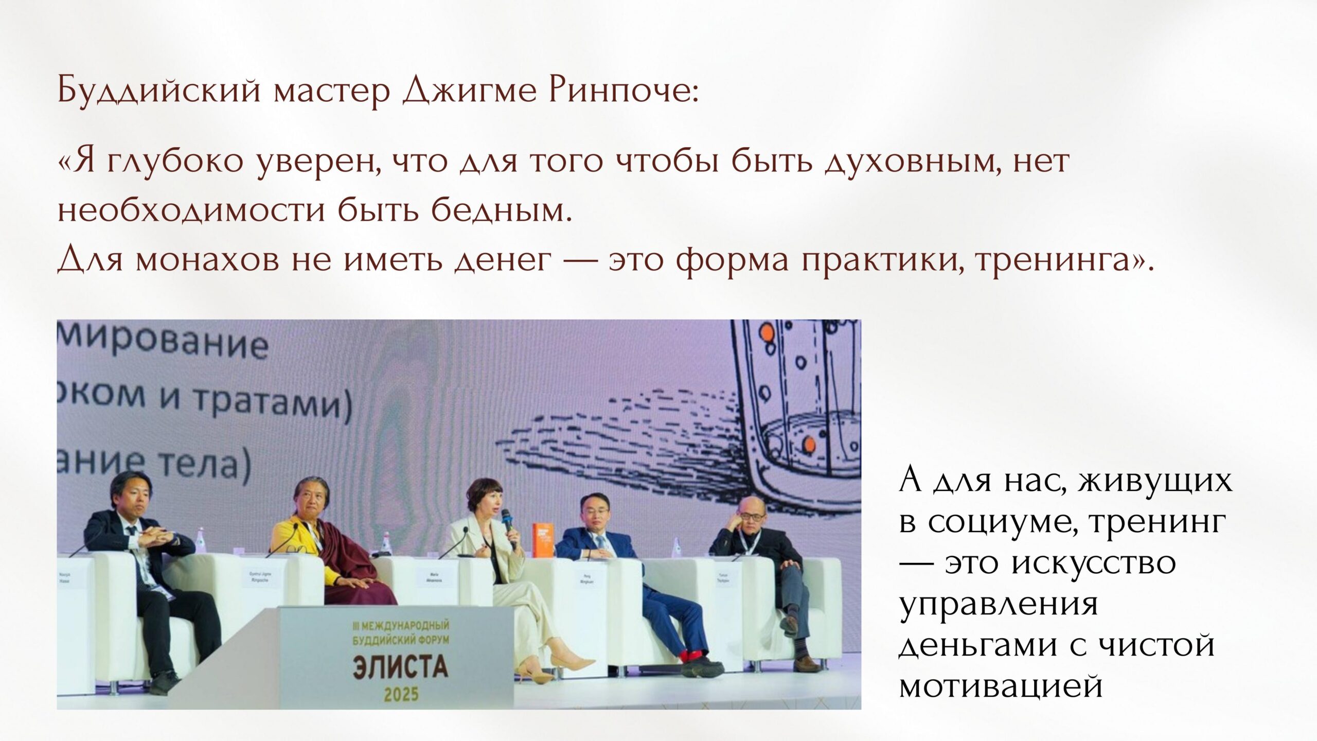 — Будда дал учение, которое нужно практиковать не только в монастырях и пещерах. Его учение можно и нужно практиковать в каждодневной жизни, ведь без денег невозможно ни построить храм, ни создать хороший социальный продукт.