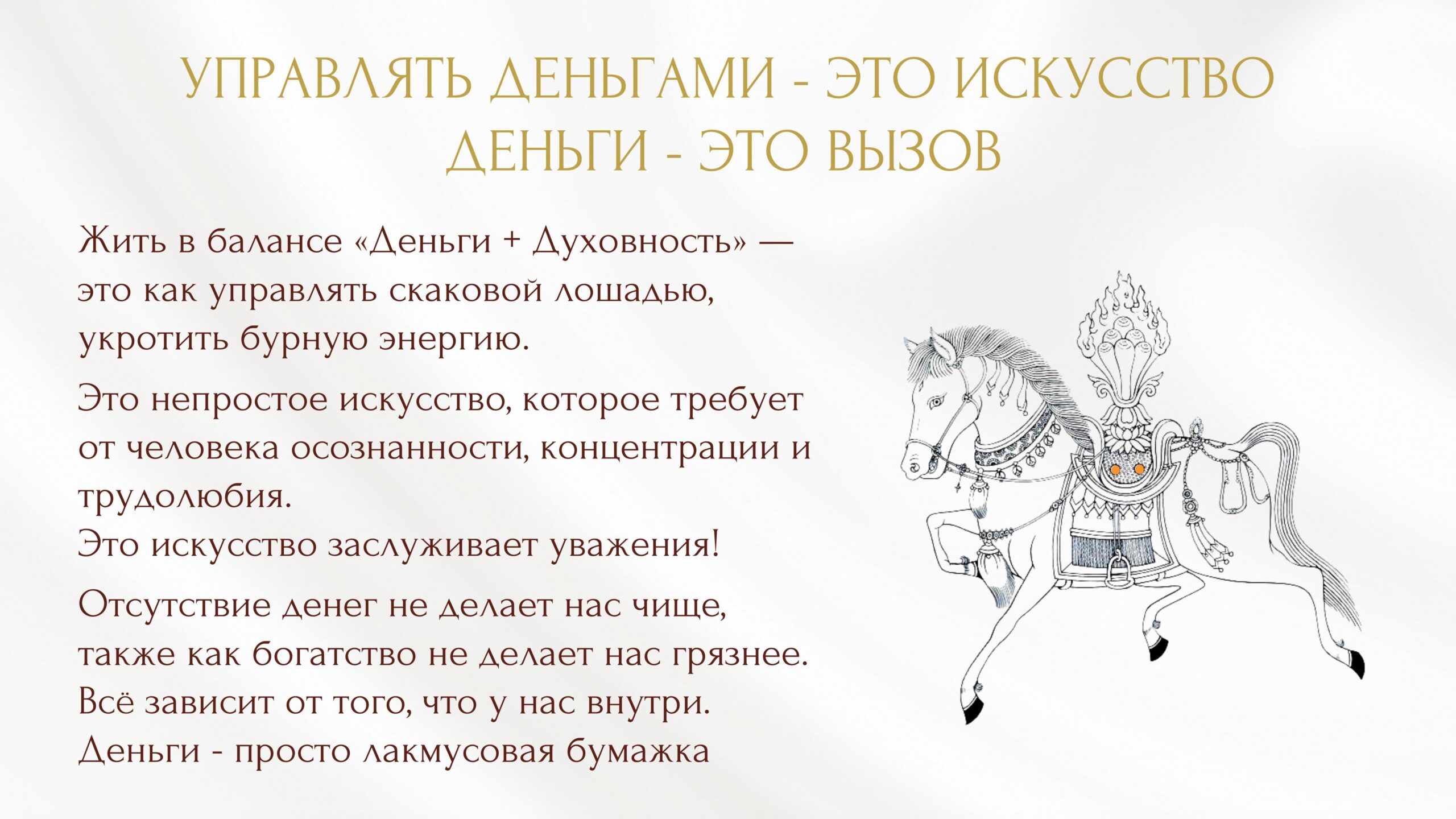 — Управлять деньгами и быть при этом духовным человеком — это особый вид искусства, подобный управлению норовистой лошадью. Отсутствие денег не делает нас чище, также как и их наличие не делает нас не чище и не грязнее. Всё зависит от того, что у нас внутри и с какой мотивацией мы делаем бизнес, приносит ли наш продукт пользу людям.