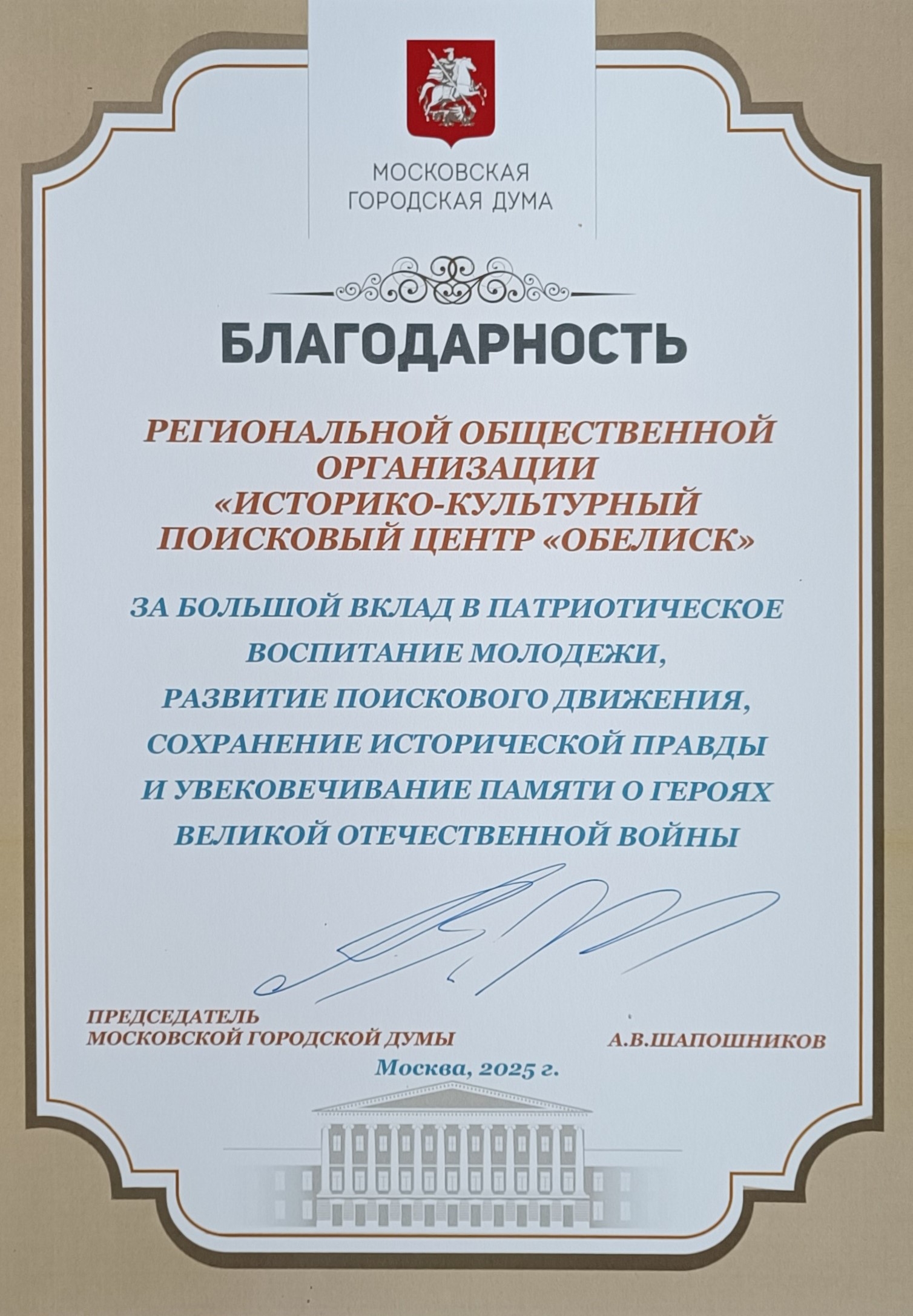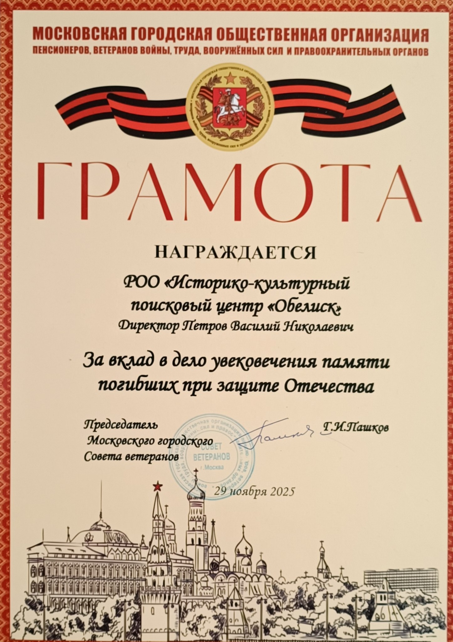Также «Обелиск» был награжден благодарностью Московском городской думы «За большой вклад в патриотическое воспитание молодежи, развитие поискового движения, сохранение исторической правды и увековечивание памяти». Василий Петров был отмечен почетной грамотой Московской городской общественной организации пенсионеров, ветеранов войны, труда, вооруженных сил и правоохранительных органов «За вклад в дело увековечивания памяти погибших при защите Отечества», а руководитель отряда «Освобождение» (часть «Обелиска») Роман Чернев получил памятный знак «Патриот Москвы» от данной организации.