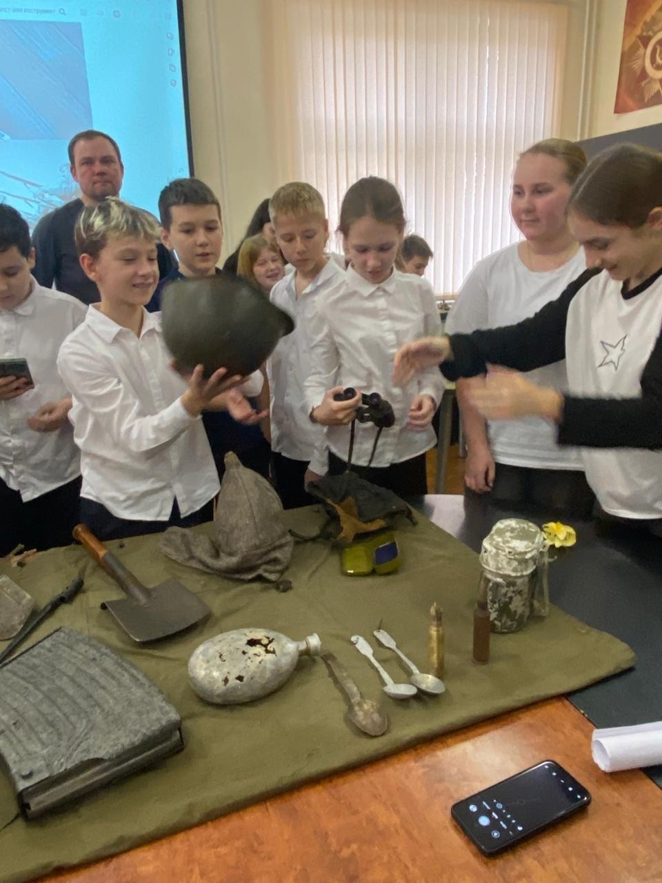 Центральным элементом встречи стала выставка подлинных находок с полей сражений под Белым: школьники увидели каски советских солдат, сапёрные лопатки, гильзы, патронные ящики, фрагменты обмундирования и другие артефакты времён Великой Отечественной войны.