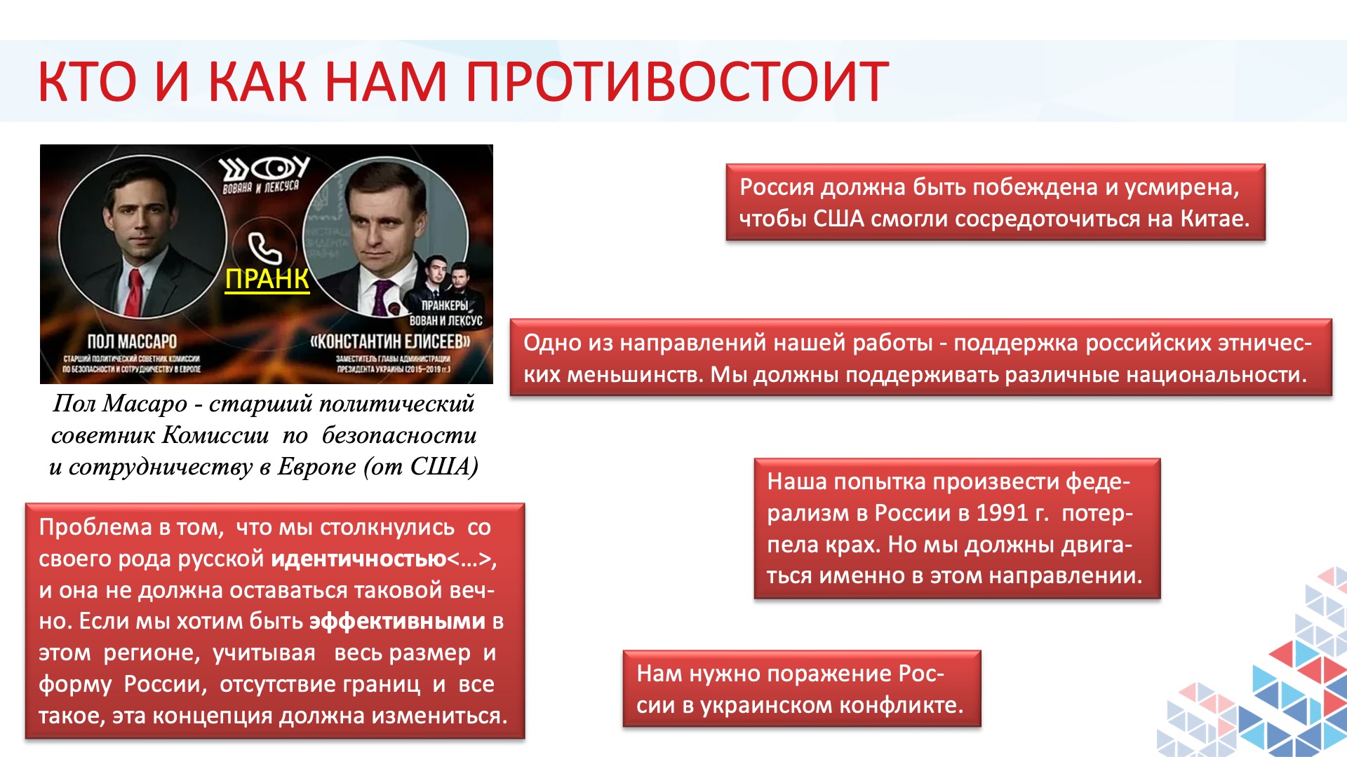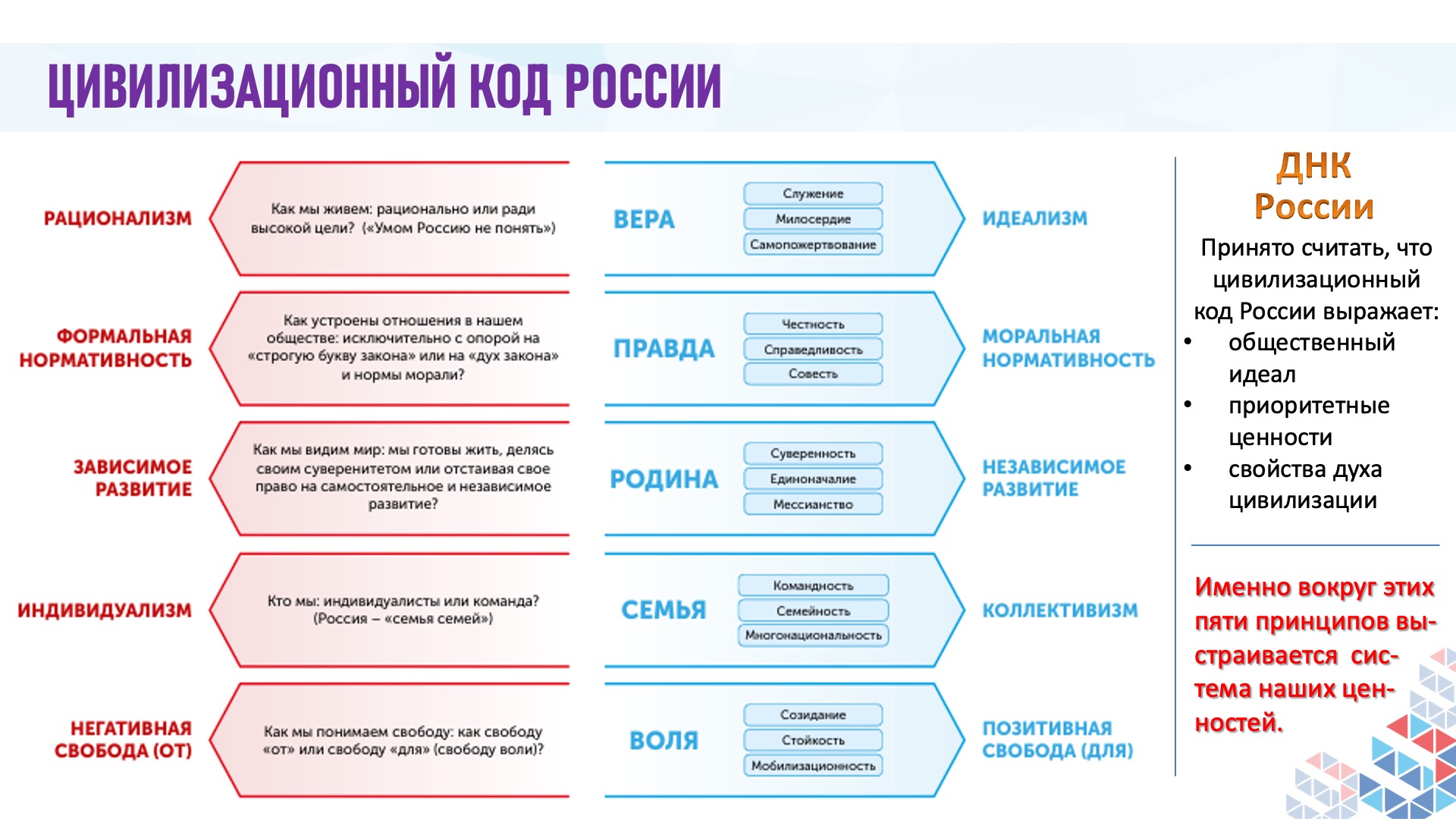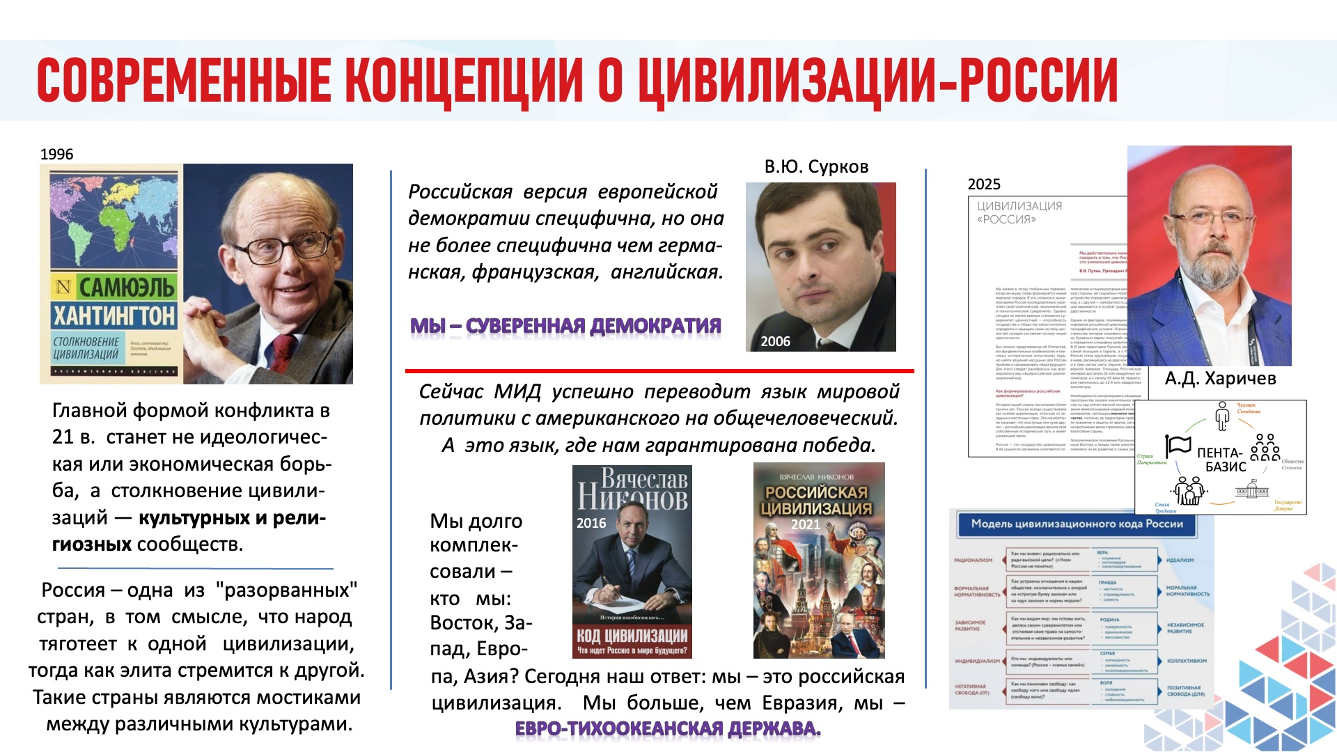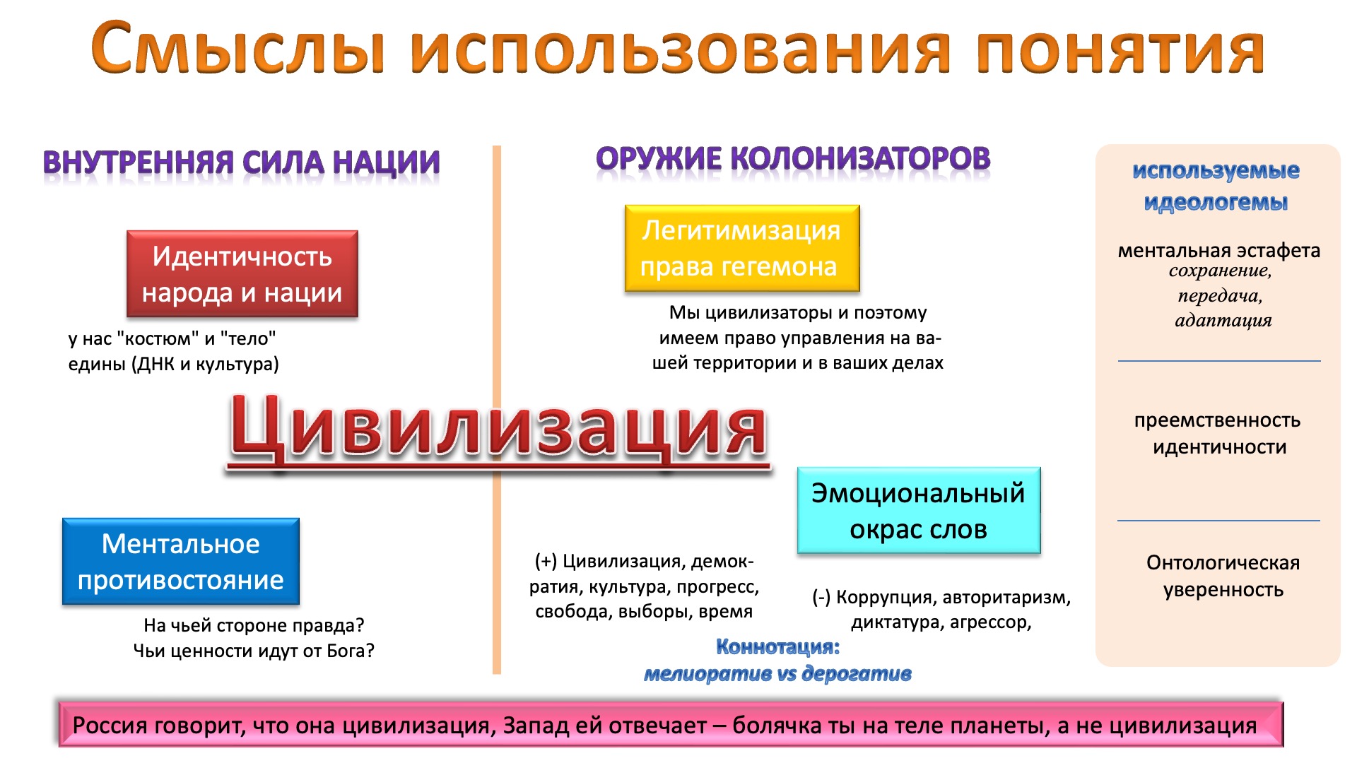 — Почему Запад отказывает России в праве называться цивилизацией? Идеологическая мотивация — попытка сохранить монополию и не допустить легитимизации альтернативных моделей развития. Геополитическая мотивация — инструмент для отрицания сфер влияния России и оправдание собственной экспансии в пограничных регионах. Стратегически — это способ удерживать Россию в рамках однополярного мира, где доминирует Запад. Интеллектуально — это следствие глубокого евроцентризма и нежелания принимать сложную самобытную природу российской истории и культуры.