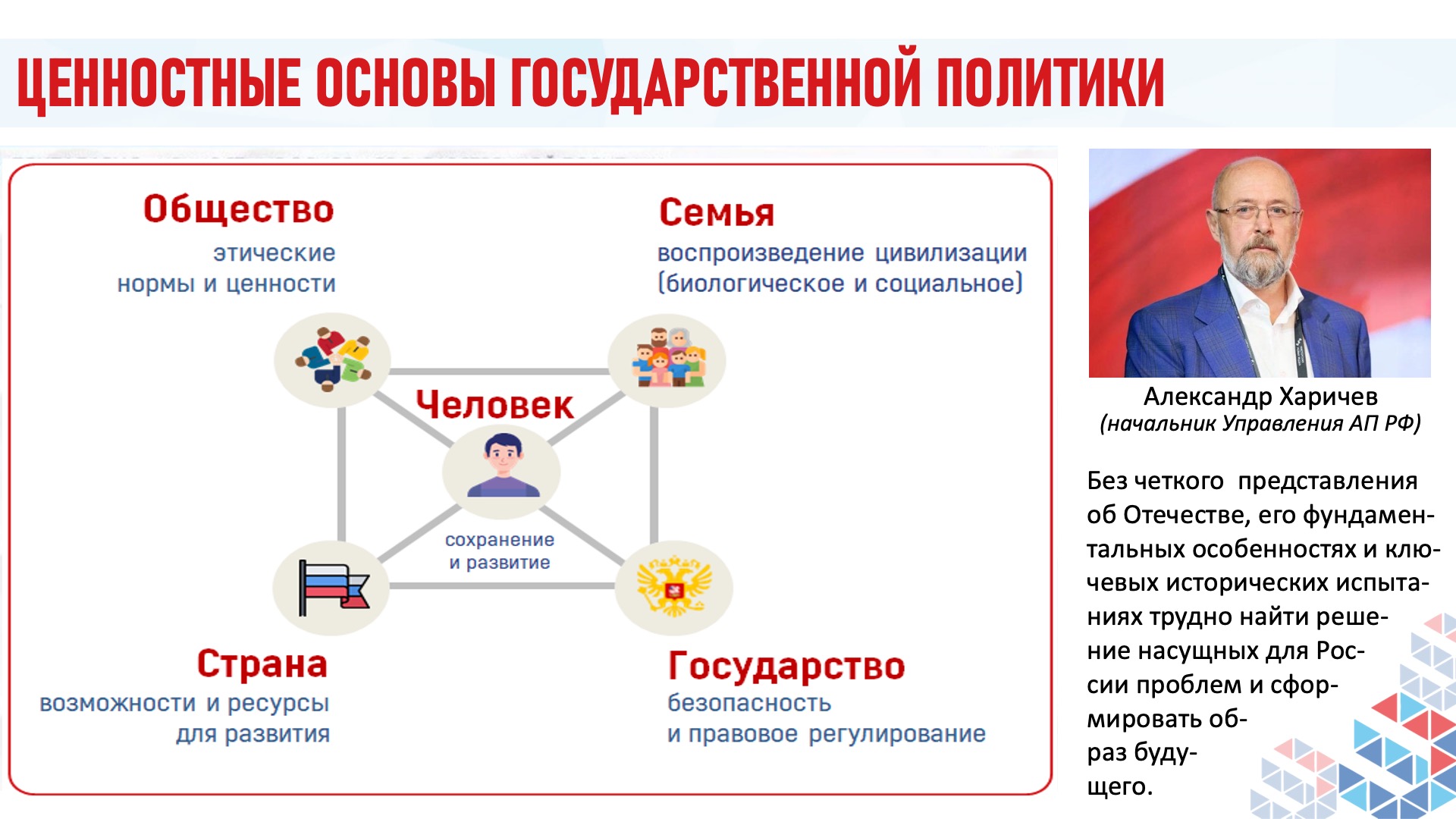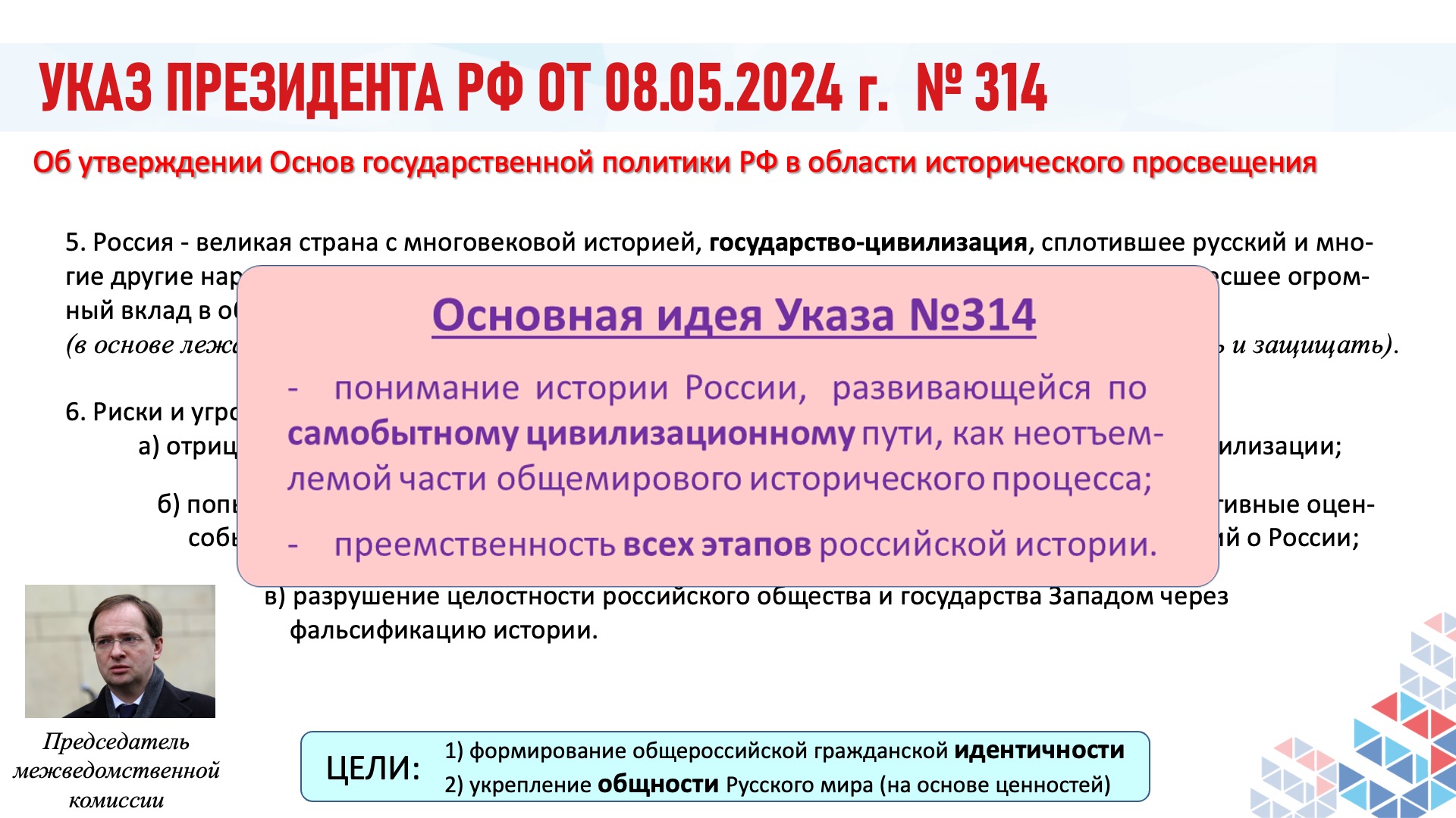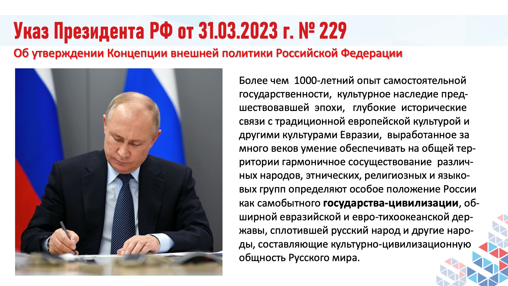 — Президент России Владимир Путин в Указе №229 «Об утверждении Концепции внешней политики Российской Федерации» ввёл понятие «государство-цивилизация». Сегодня мы живём в этой парадигме. И это право мы будем отстаивать.