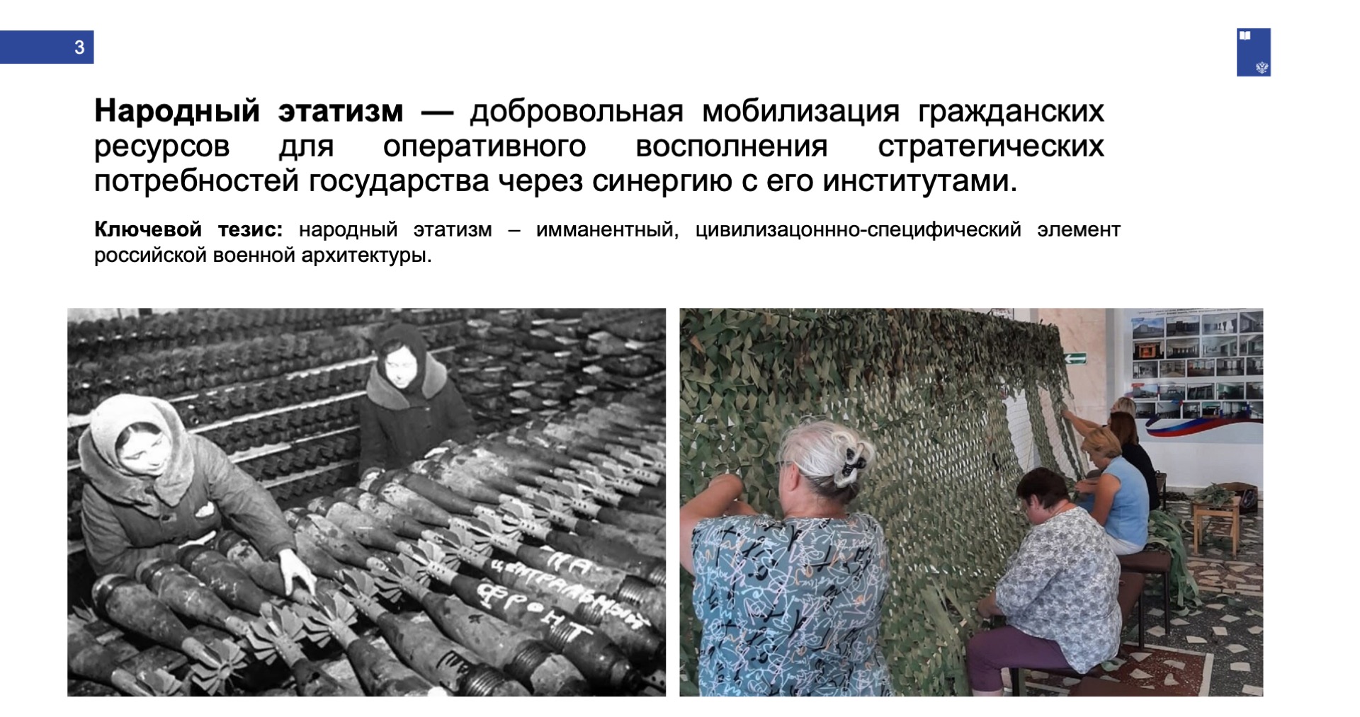 — Участие населения в обороне страны — закономерный механизм, проявляющийся на переломных этапах: от ополчения Минина и Пожарского и партизан Великой Отечественной до волонтеров Специальной военной операции. Народные инициативы всегда восполняли дефициты официальных институтов. Сегодня война пятого поколения требует такого же синтеза государства и общества. А для того, чтобы этот синтез произошел, должны быть созданы институциональные мосты между государством и народом.
