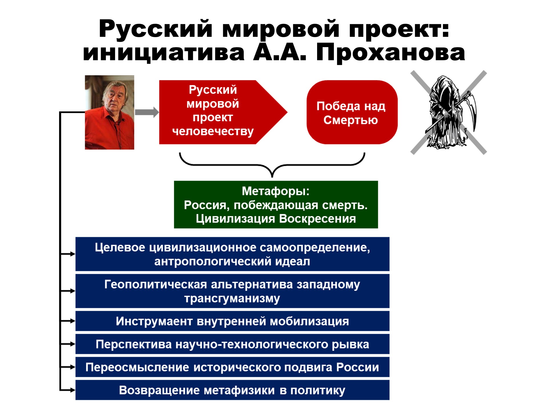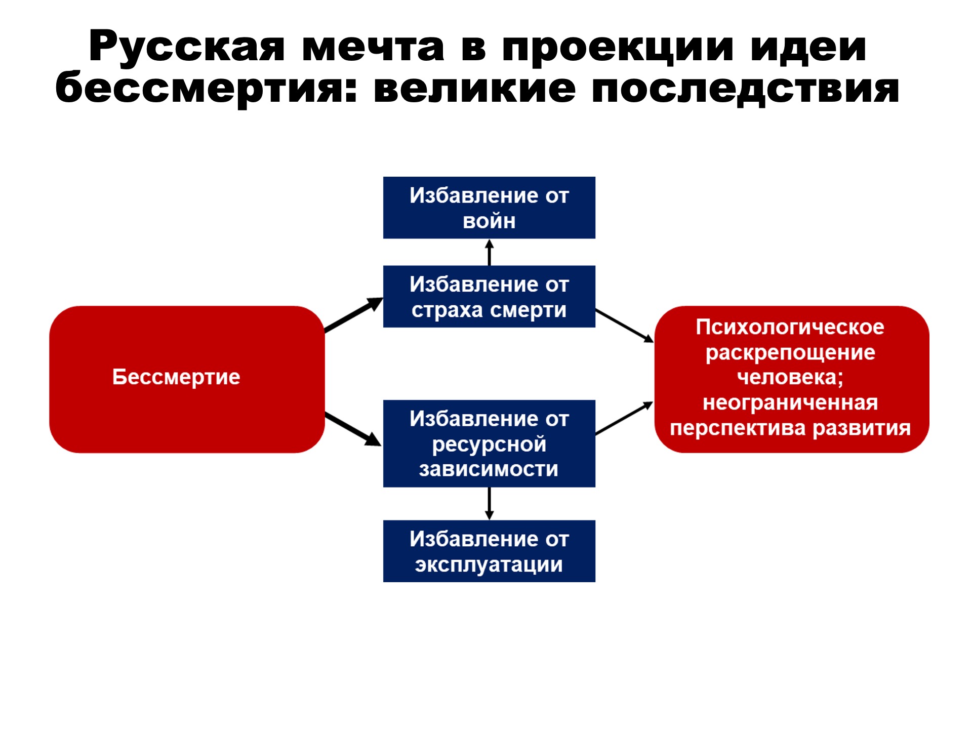 — Русская Мечта, сформулированная как «победа над смертью» и «воскрешающая цивилизация», может стать мобилизующей идеей для всего человечества, противопоставленной западной утопии бессмертия для элит. Будущее — это выбор и борьба, а не естественное течение событий.