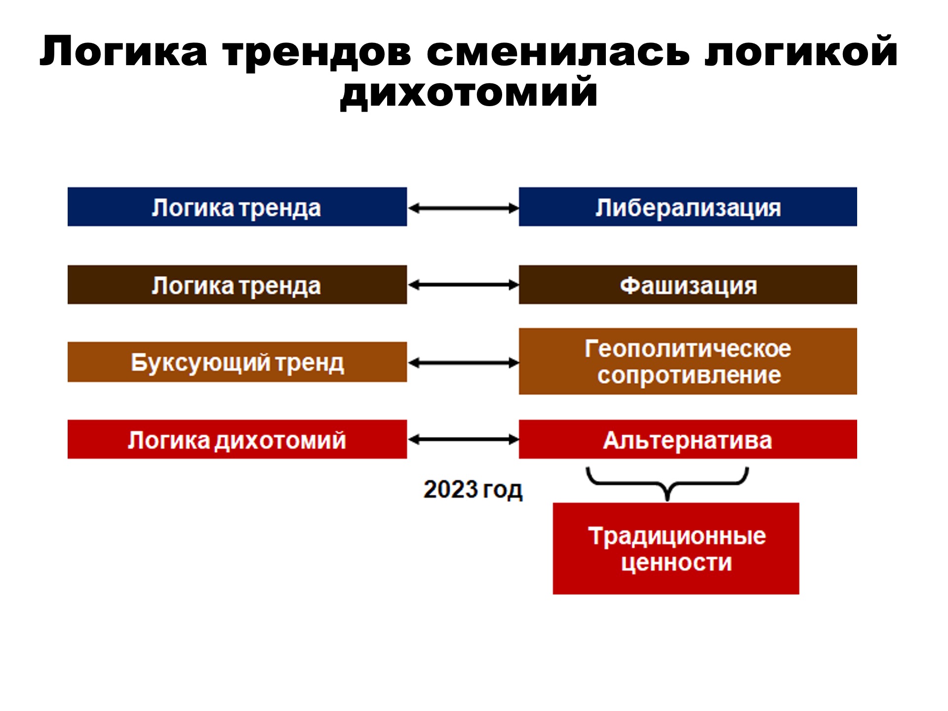 — Будущее сегодня определяется как развилка: технофашизм и трансгуманизм Запада или образованное человечество и духовное преображение, которое предлагает Россия. Западная модель ведёт к деградации человека, российская — к возвращению смыслов и мировоззрения.