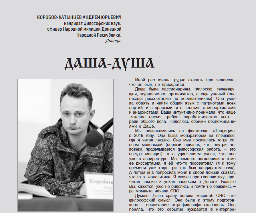 Дарья Дугина положила свою жизнь, чтобы осмыслить и громко заявить разным культурам и цивилизациям о том, что Русский мир существует, Русская мысль живет, а Русская мечта очень нужна всему человечеству. И вот коллектив единомышленников, состоящий из профессиональных философов, литераторов, представителей разных конфессий, политиков и военных из более чем десятка городов России, решил поднять те вопросы, за которые погибла Даша Дугина.