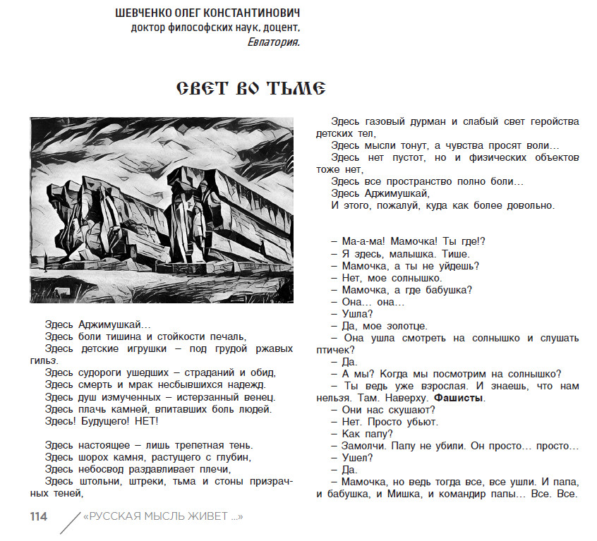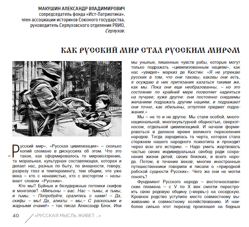 Так родилась уникальная и единственная в своем роде книга о Русском Мире, Русской Идее, Русской Мечте под названием «Русская мысль живёт…». Это — написанный живым литературным языком литературно-философский сборник произведений различных жанров: интервью, статей, эссе, рассказов, стихов. Среди авторов сборника — философ и военнослужащий из Донецка Андрей Коробов-Латынцев, руководитель одного из подмосковных отделений Российского военно-исторического общества Александр Макушин, фольклорист Марианна Дударева, доктора философских наук, преподаватели различных российских университетов, литераторы и поэты, проживающие в различных российских городах — от Архангельска до Симферополя, от Севастополя — до Москвы. Предисловие к изданию написали Глава Крыма Сергей Аксенов и председатель Госсовета Республики Владимир Константинов.