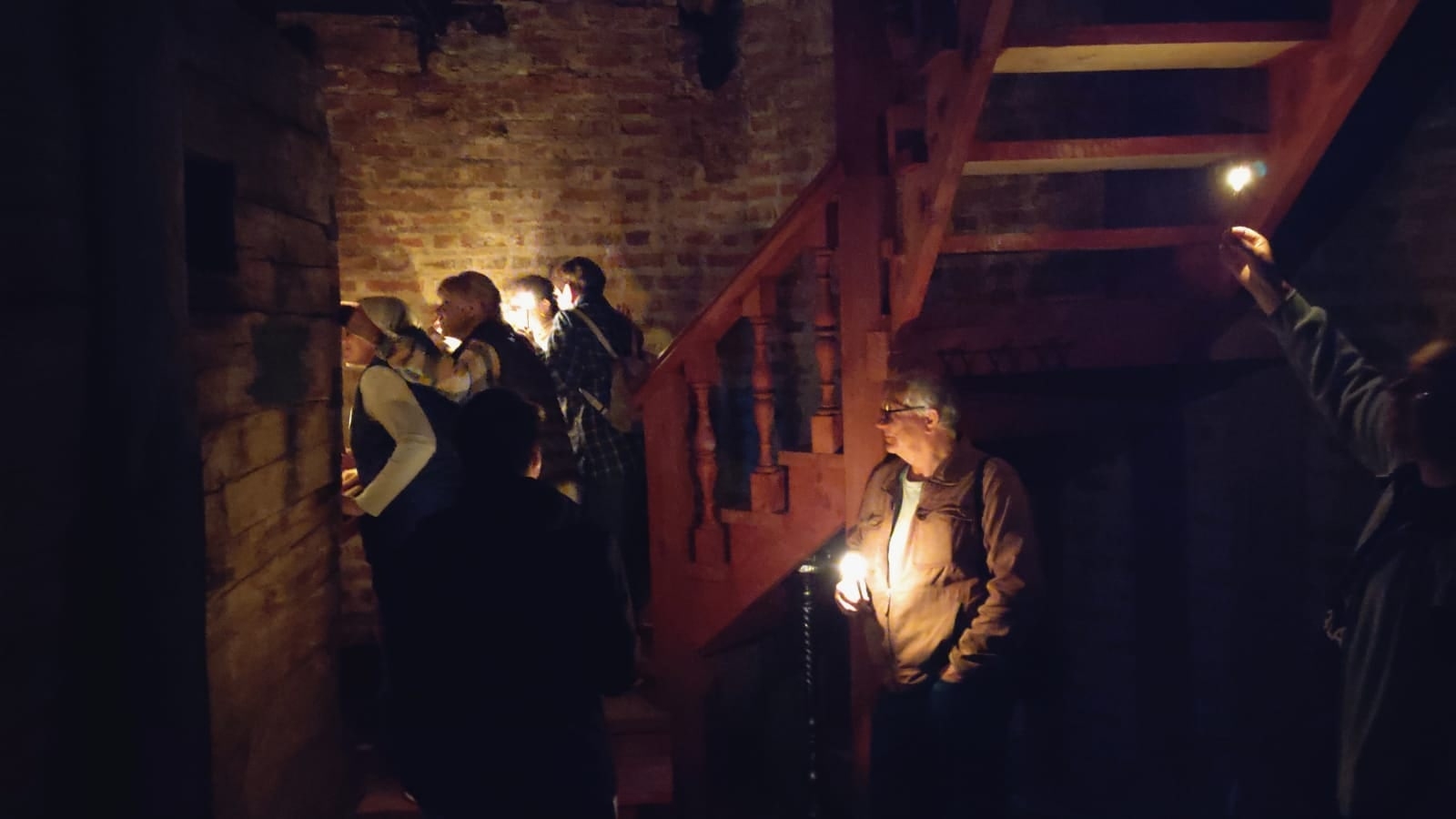 Для создания таинственной атмосферы вечерняя экскурсия по колокольне проходит без электричества — со свечами и керосиновым фонарём.